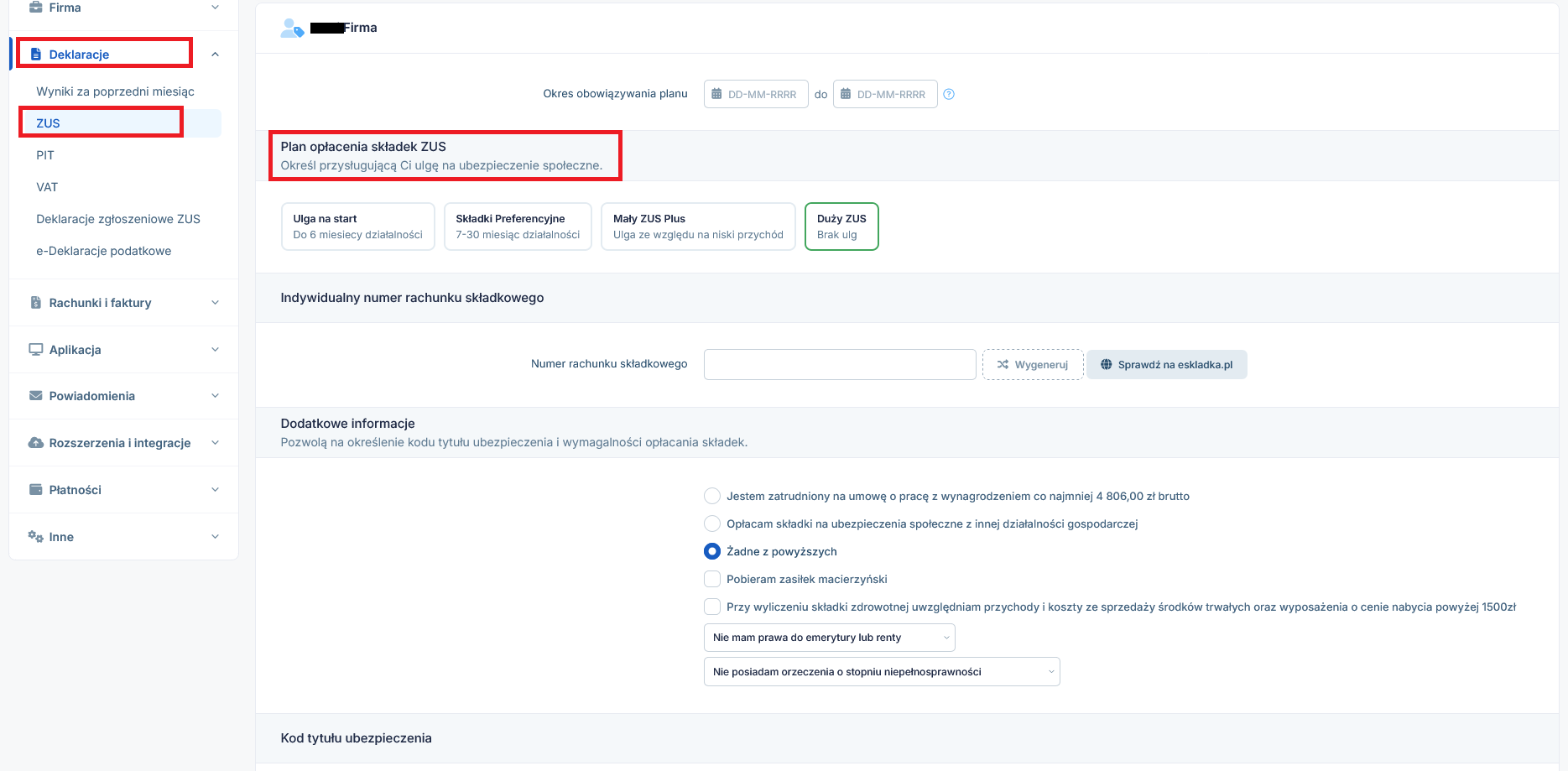 Przedsiębiorcy, którzy korzystają z programu IFIRMA mają możliwość wygenerowania deklaracji ZUS po uprzednim wybraniu planu opłacania składek. Dokonujemy tego w zakładce Dane i konfiguracja → Deklaracje → Deklaracje ZUS.