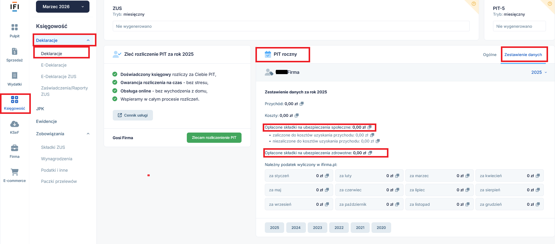 W programie IFIRMA w zakładce Księgowość → Deklaracje → PIT roczny → Zestawienie danych widoczna będzie wysokość opłaconych składek na ubezpieczenie społeczne i zdrowotne.