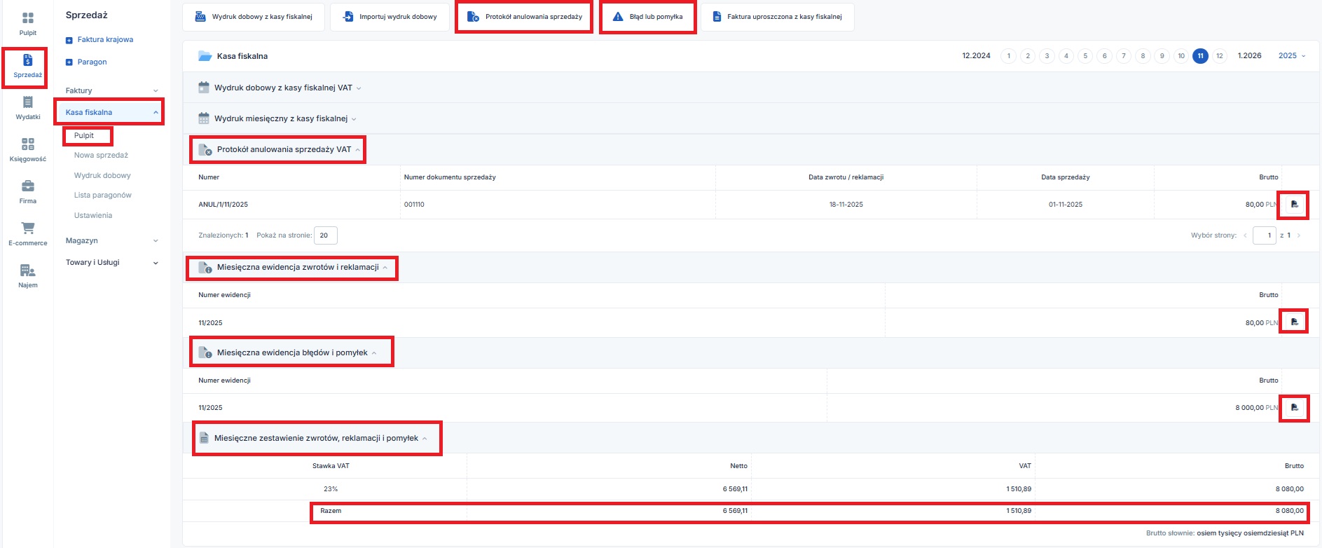 W serwisie zapisu dokonujemy w zakładce Sprzedaż ➡ Kasa ➡ fiskalna ➡ Pulpit za pomocą opcji Błąd lub Pomyłka. Sumaryczna wartość wynikająca z ewidencji pomyłek wpływa na wartość raportu miesięcznego ujętego w raporcie dobowym widocznym w KPiR/ewidencji przychodów oraz ewidencji sprzedaży VAT. Wydrukowana po zakończeniu miesiąca miesięczna ewidencja błędów i pomyłek oraz ewidencja zwrotów i uznanych reklamacji powinna być dołączona do raportu miesięcznego z kasy fiskalnej.