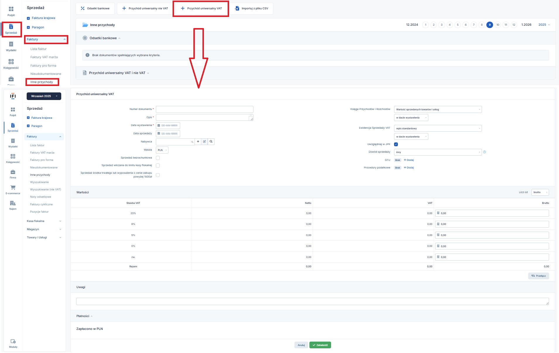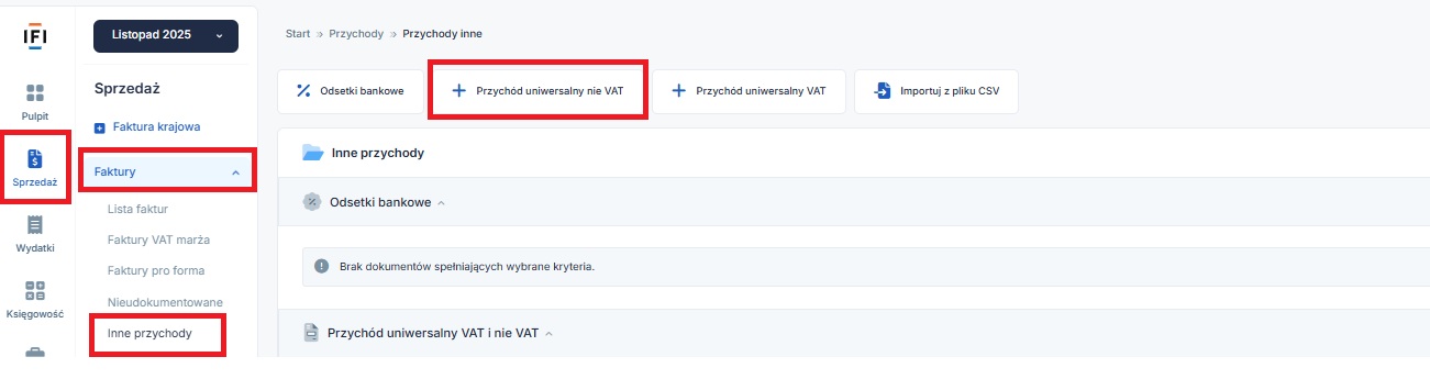 Czynny podatnik podatku VAT zapisu w serwisie dokonuje w zakładce Sprzedaż ➡ Faktury ➡ Inne przychody ➡ Przychód uniwersalny VAT.