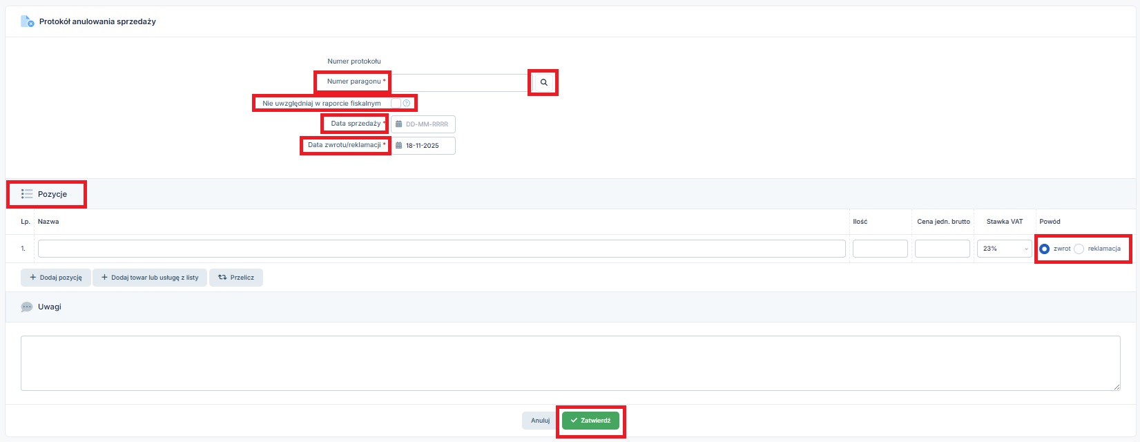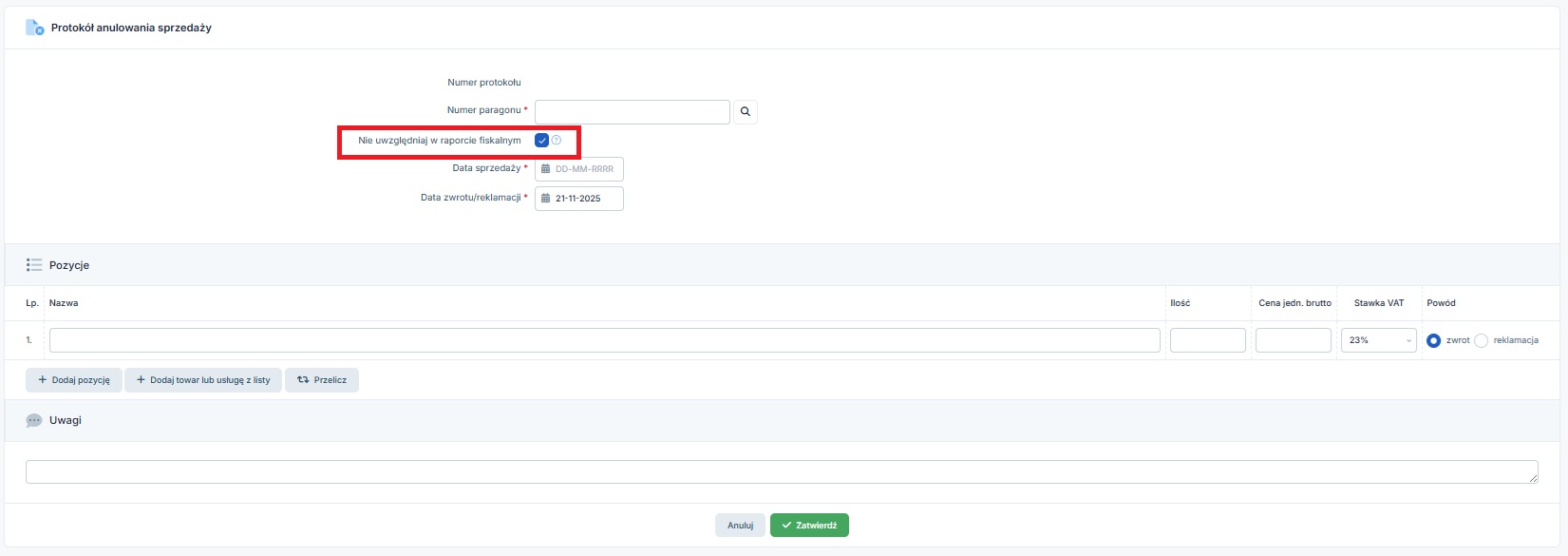 Formularz Protokołu anulowania sprzedaży wygląda następująco: