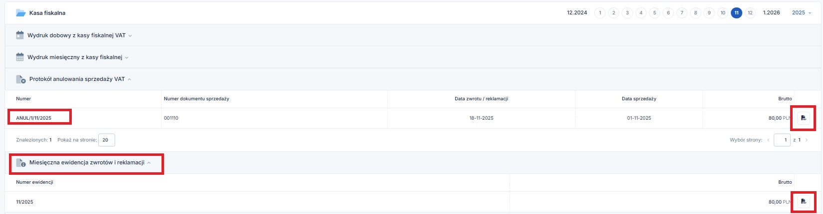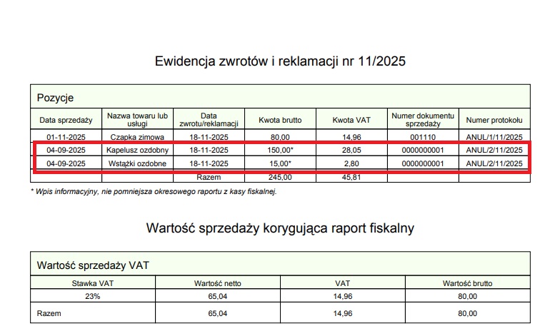 Po zakończeniu miesiąca sprzedawca drukuje Miesięczną ewidencje zwrotów i reklamacji, dołączając do niej protokoły zwrotu towaru. Jej sumaryczna wartość pomniejszy kwotę miesięcznego raportu z kasy fiskalnej widocznego w ewidencjach podatkowych.