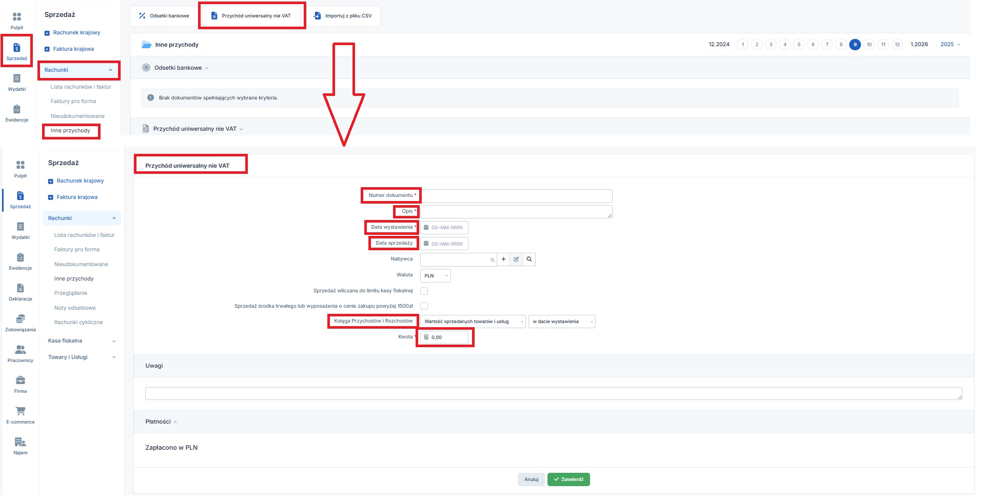* w przypadku przedsiębiorcy korzystającego ze zwolnienia z VAT zapisy byłby dokonywany w zakładce Sprzedaż ➡ Rachunki ➡ Inne przychody ➡ Przychód uniwersalny nie VAT.