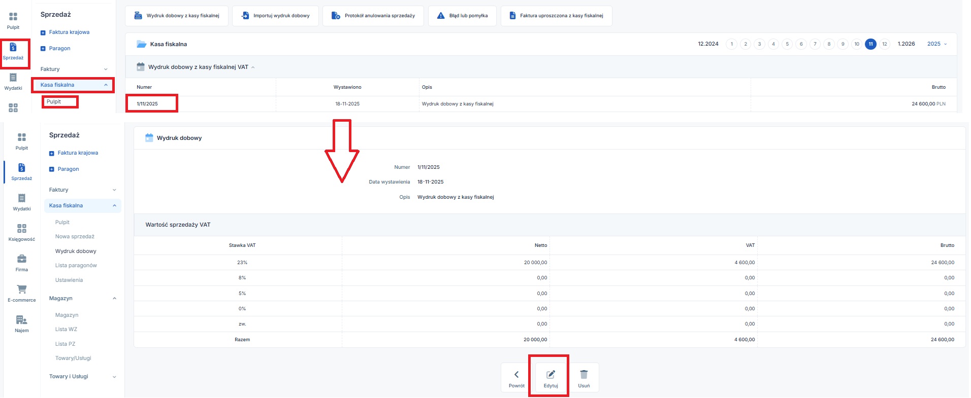 Zmniejszenia oraz zwiększenia wartości raportu można dokonać przez jego edycję. W tym celu należy ustawić miesiąc księgowy zgodny z datą wystawienia dokumentu i przejść do zakładki Sprzedaż ➡ Kasa fiskalna ➡ Pulpit, a następnie kliknąć numer wydruku dobowego. Na dole formularza dostępna będzie opcja edycji.
