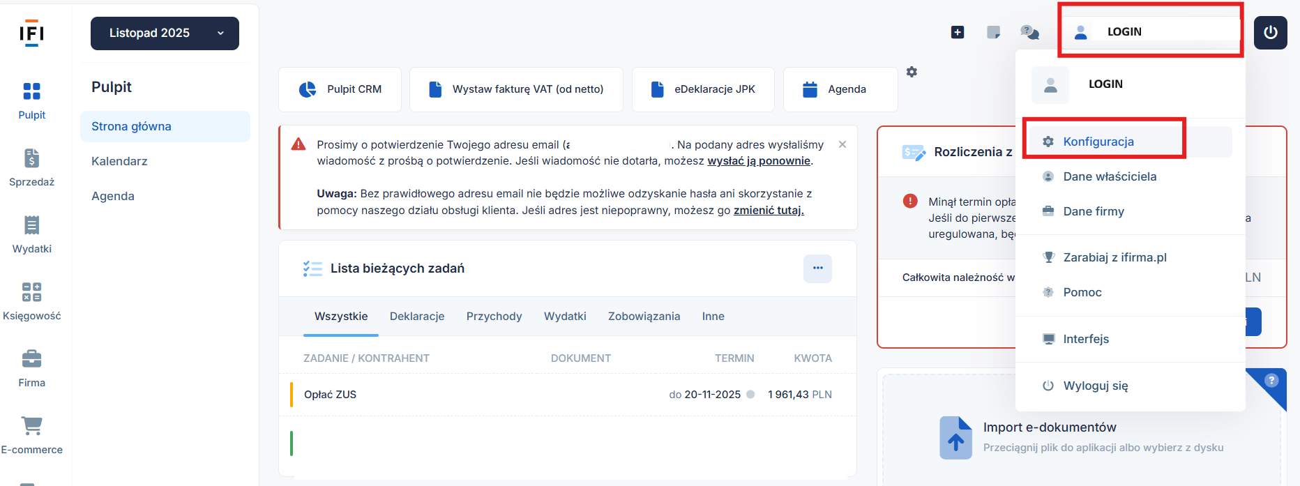Aby przejść do zestawienia danych w systemie ifirma.pl należy najechać na swój Login, a następnie kliknąć w ikonkę Konfiguracja.
