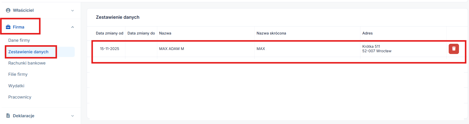W tym miejscu widoczne są dokonywane zmiany danych firmy: nazwy firmy, nazwy skróconej lub zmiany adresu przez użytkownika. Tylko przy zmianie danych firmy i wybraniu pierwszej opcji zmieniły się dane firmy, serwis wyświetli informacje z jakim dniem, miesiącem i rokiem dokonano zmiany, do kiedy obowiązywała zmiana i jakie dane zostały zmienione.