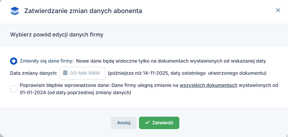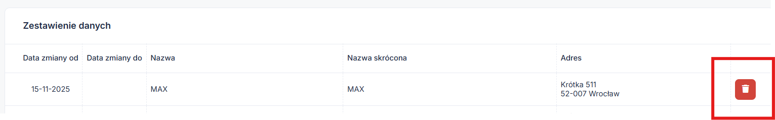Opcja usunięcia może być nieaktywna w sytuacji, gdy użytkownik wystawił faktury sprzedaży po zmianie danych w serwisie. W przypadku kiedy firma nie zmieniała danych wtedy opcja nie będzie w ogóle widoczna.
