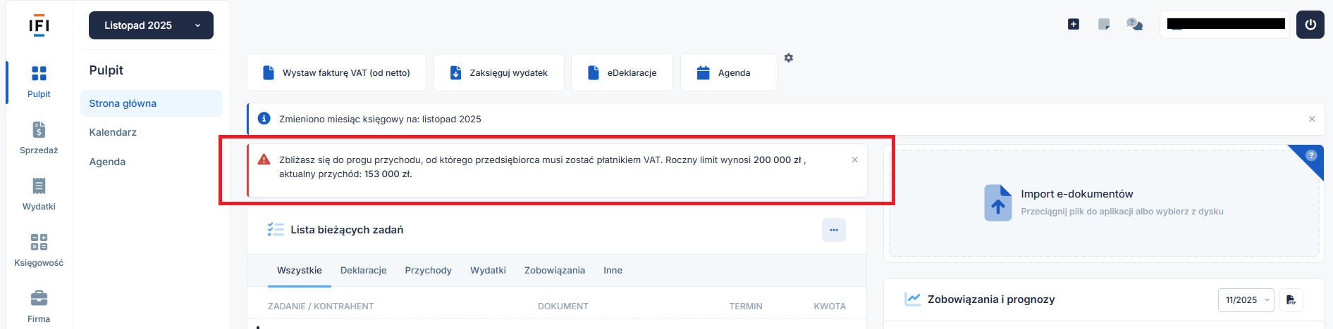 Kiedy przedsiębiorca zacznie zbliżać się do przekroczenia limitu VAT, w zakładce Pulpit zaczną pokazywać się komunikaty, informujące zbliżanie się do przekroczenia limitu, przykład na zrzucie.