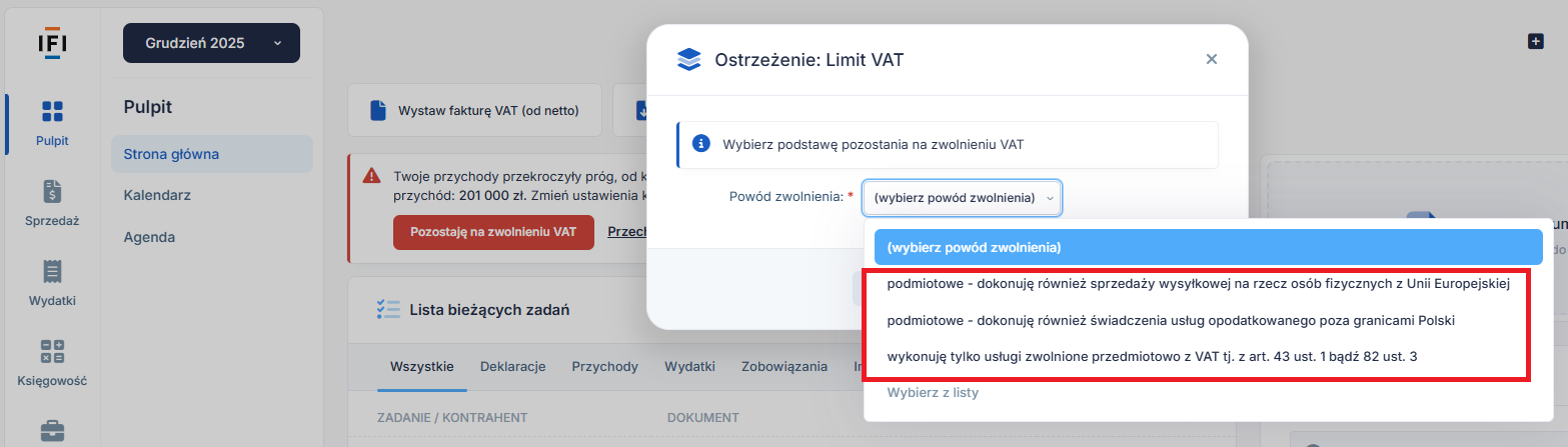 Jeżeli jednak przedsiębiorca wykonuje usługi, dokonuje dostaw, jakie są poza limitem VAT (punkt 3 instrukcji), przez co efektywnie limit dla VAT nie zostaje przekroczony, wtedy wybiera opcję Pozostaję na zwolnieniu VAT, następnie wybierając właściwy powód z rozwijalnej listy.